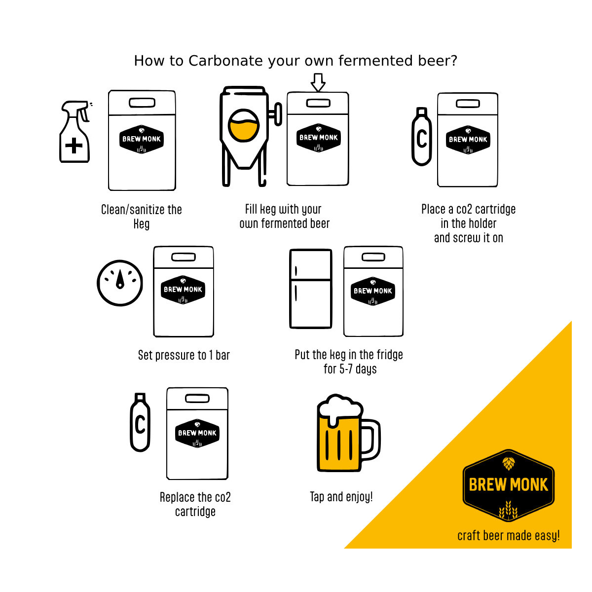 Das Brew Monk™ Mini Keg funktioniert mit 16 g CO₂-Kartuschen, die eine einfache Handhabung und konstanten Druck ermöglichen. Der integrierte Druckregler sorgt für volle Kontrolle beim Zapfen – egal, ob du eine feine Schaumkrone für dein Bier oder einen sauber gezapften Cocktail wünschst.