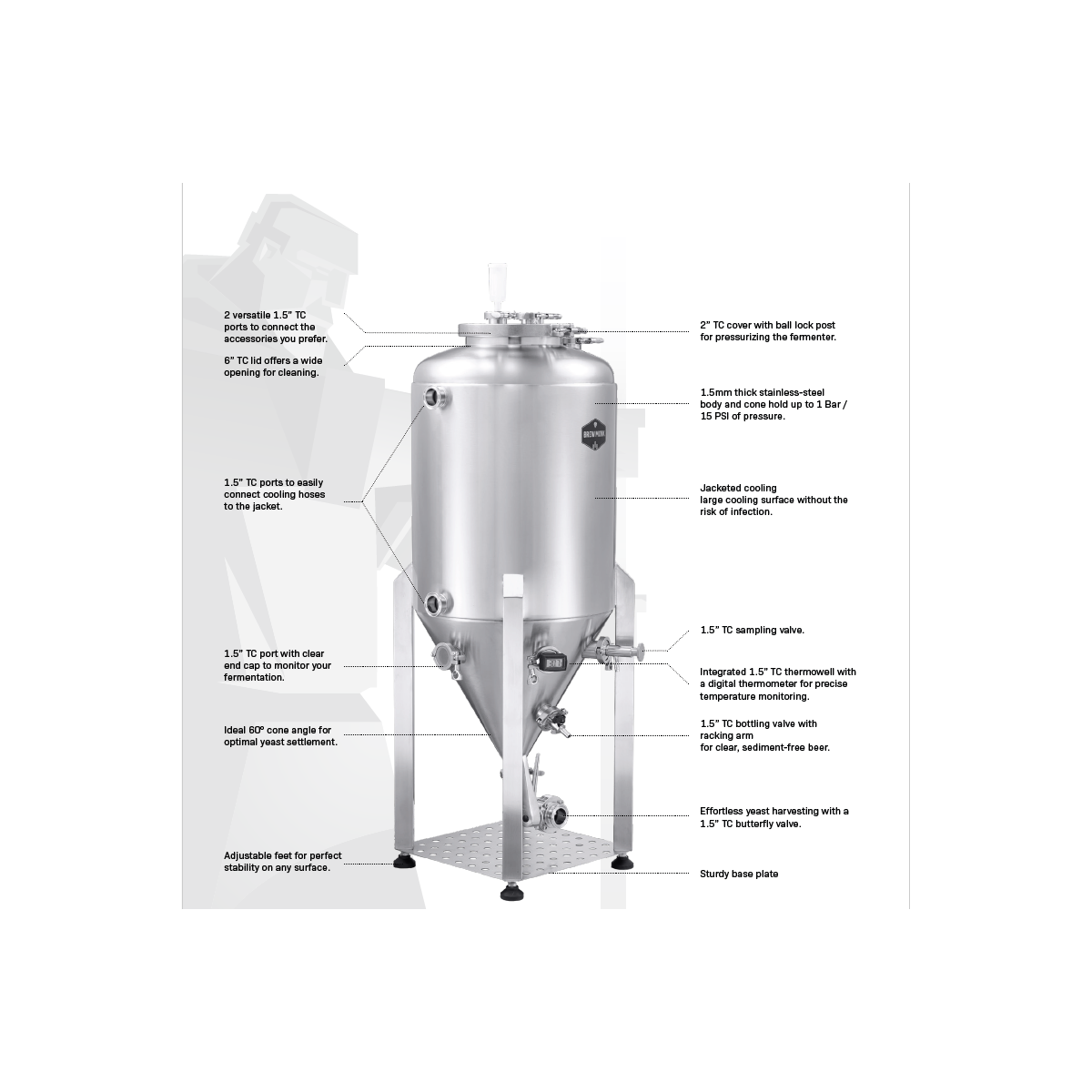 Mit dem Brew Monk™ Unitank erhältst du einen druckfesten Profi-Fermenter, der Funktionen bietet, die sonst nur in deutlich höheren Preisklassen zu finden sind. Ideal für ambitionierte Heimbrauer und Semi-Professionelle, die ihr Brauen aufs nächste Level heben wollen.